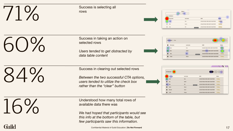 We ran usability tests to validate our assumptions. Could users instinctively navigate the new bulk action feature, drawing from their experience with similar tools? Would they easily see the connection between the table content and the action bar? It was time to find out.