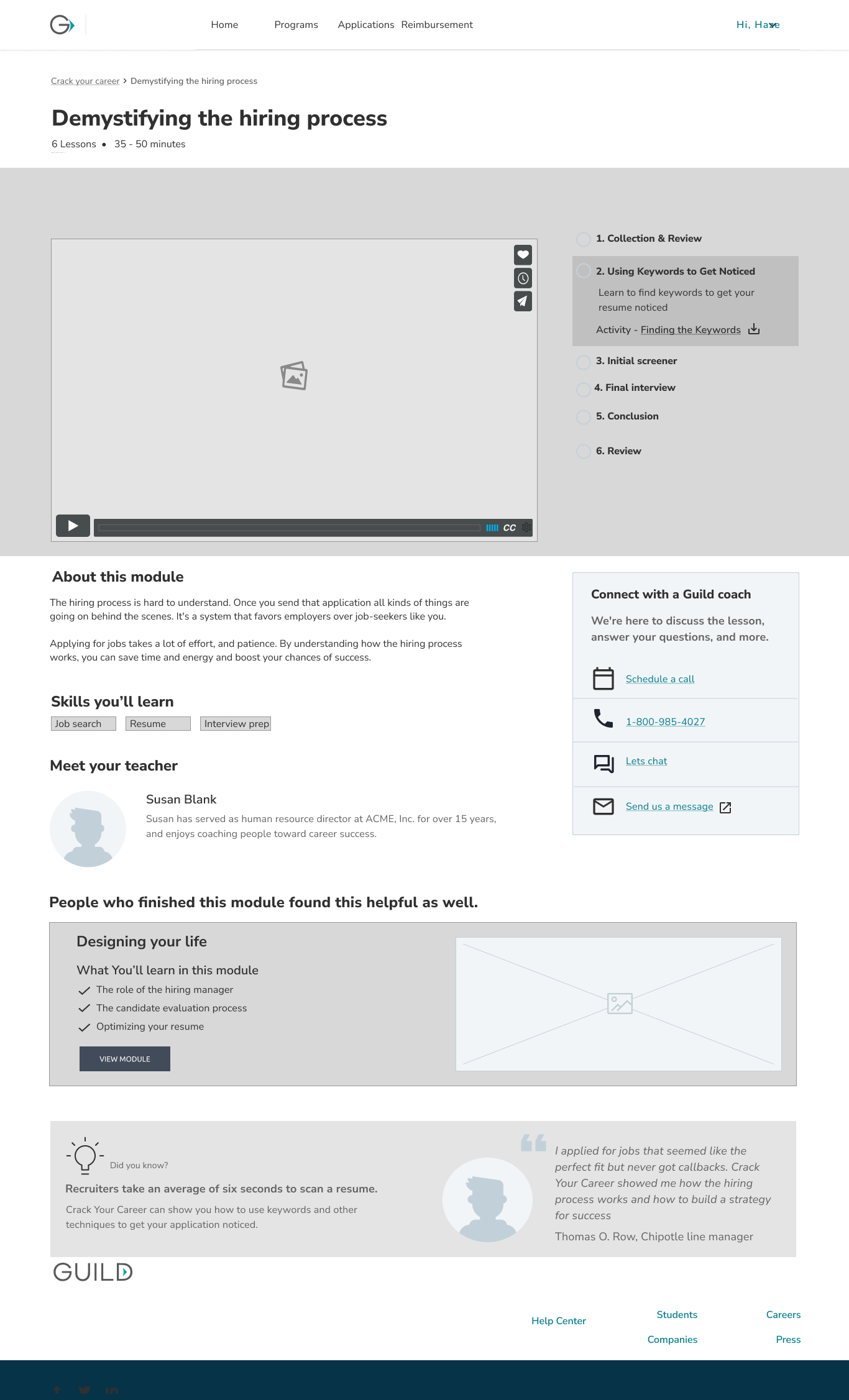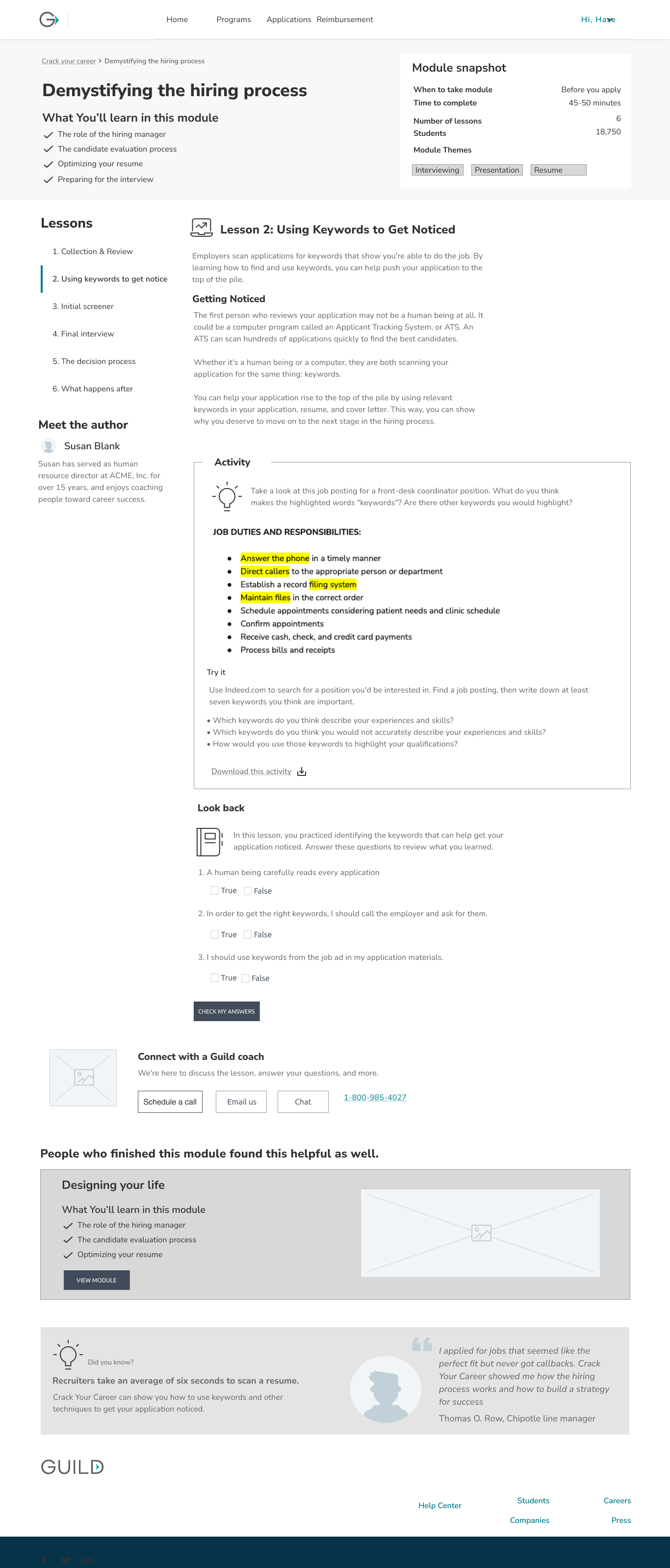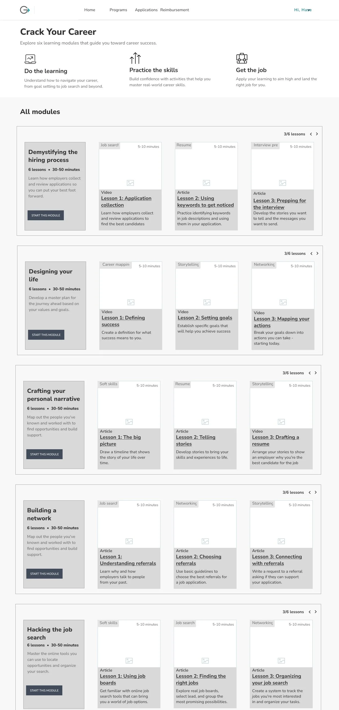 To deliver fast, we prioritized the self-guilded format, eliminating any complex personalization features due to lack of strong evidence that would support the work's value. For MVP we organized lessons into a simple module format and removing non-essential elements like testimonials.